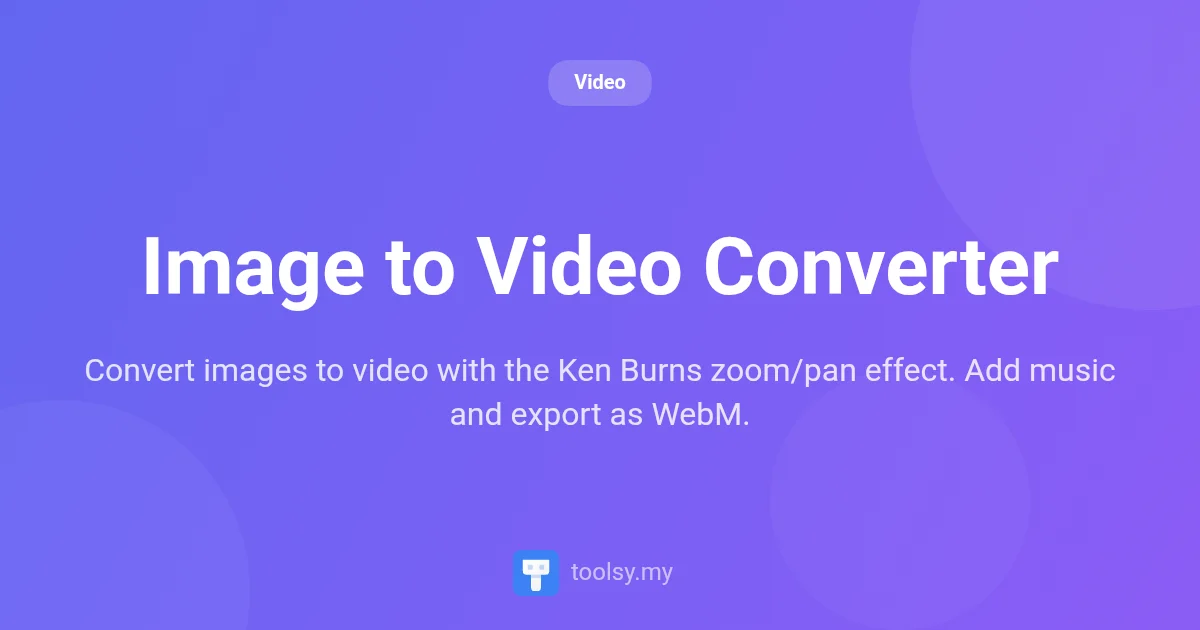 Convert images to video with the Ken Burns zoom/pan effect. Add music and export as WebM.